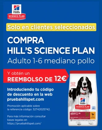 «a la referencia de Science Plan Canine Adult Medium Pollo 14kg de Hill’s que se haya adquirido en establecimientos especializados de venta de pienso de mascotas (quedan excluidas las clínicas veterinarias y tiendas del grupo Iskaypet). Tenga en cuenta que las grandes plataformas generalistas online, por ejemplo, Amazon y eBay, no son puntos de venta que cumplan con dicha política, por lo que los tickets de compra de nuestros productos en estas plataformas no serán válidos. Algunos ejemplos de sitios web que cumplen con nuestros requisitos son Guaw, Crazy Pet, El Corte Inglés, Mascotas Avila, Pienso Express, Interzoo y Zooplus.»