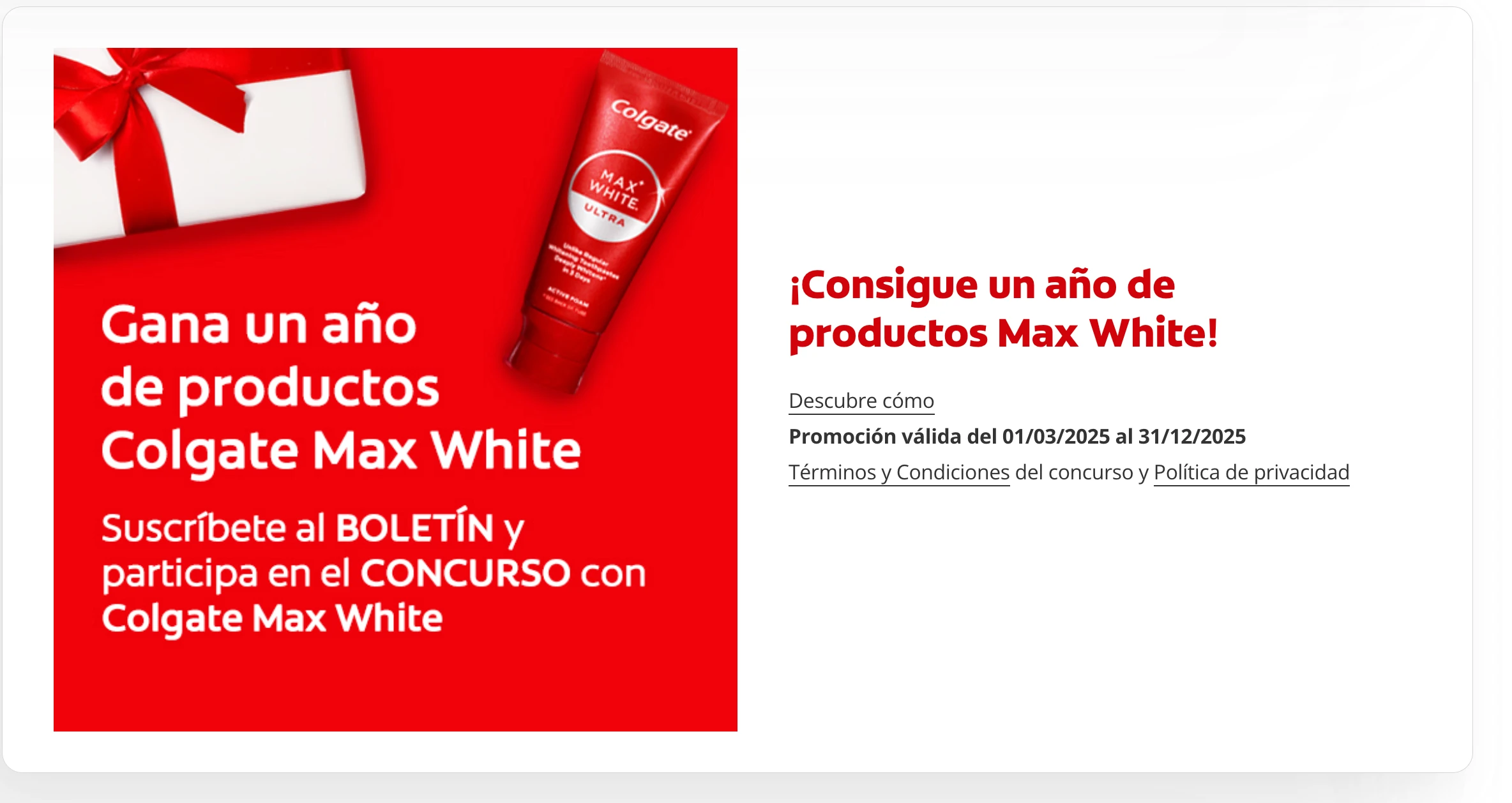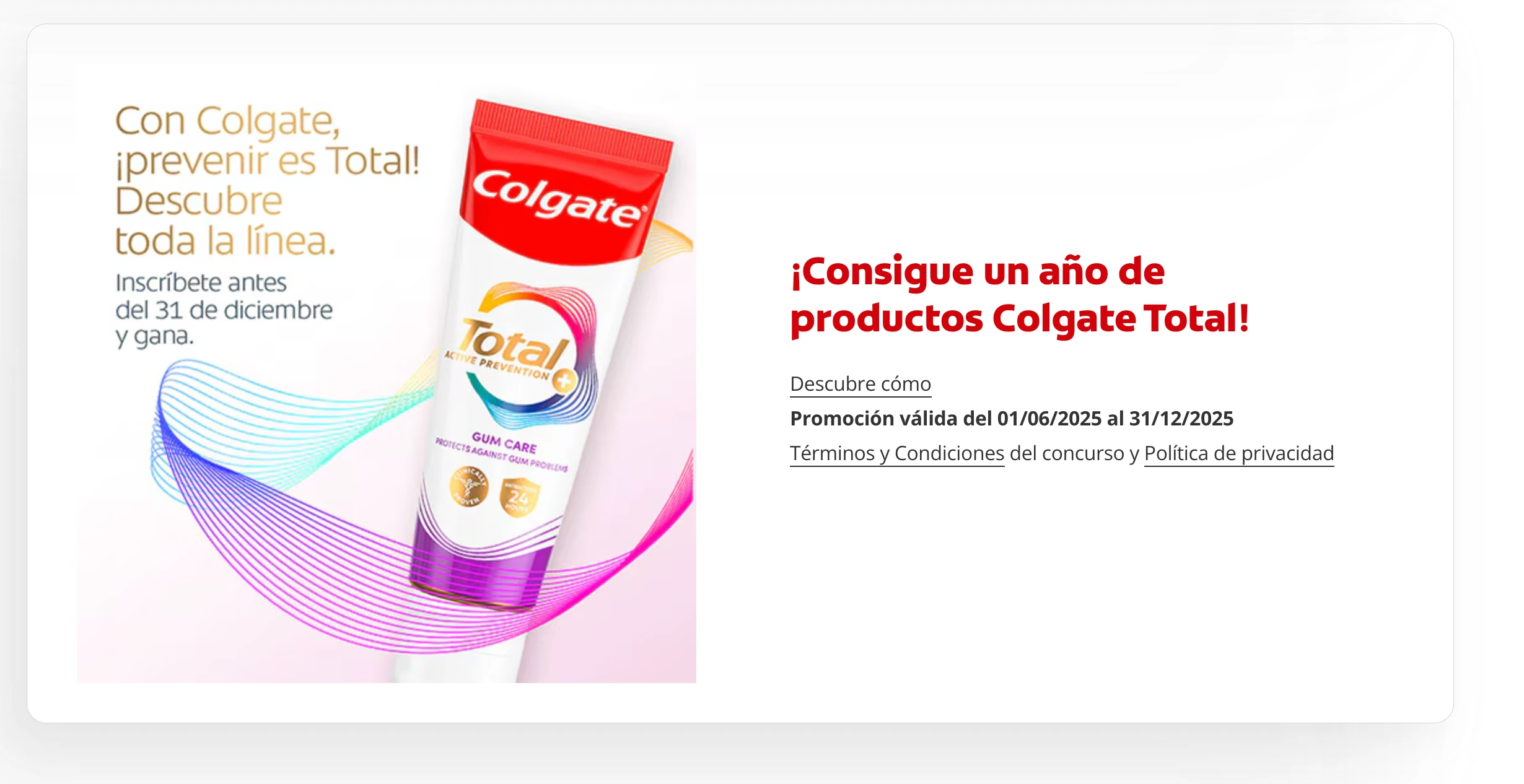 La marca Colgate pone en marcha esta promoción (válida para España, hasta el 31 diciembre 2025) en formato de concurso gratuito, con el que podrás optar a ganar sus productos.